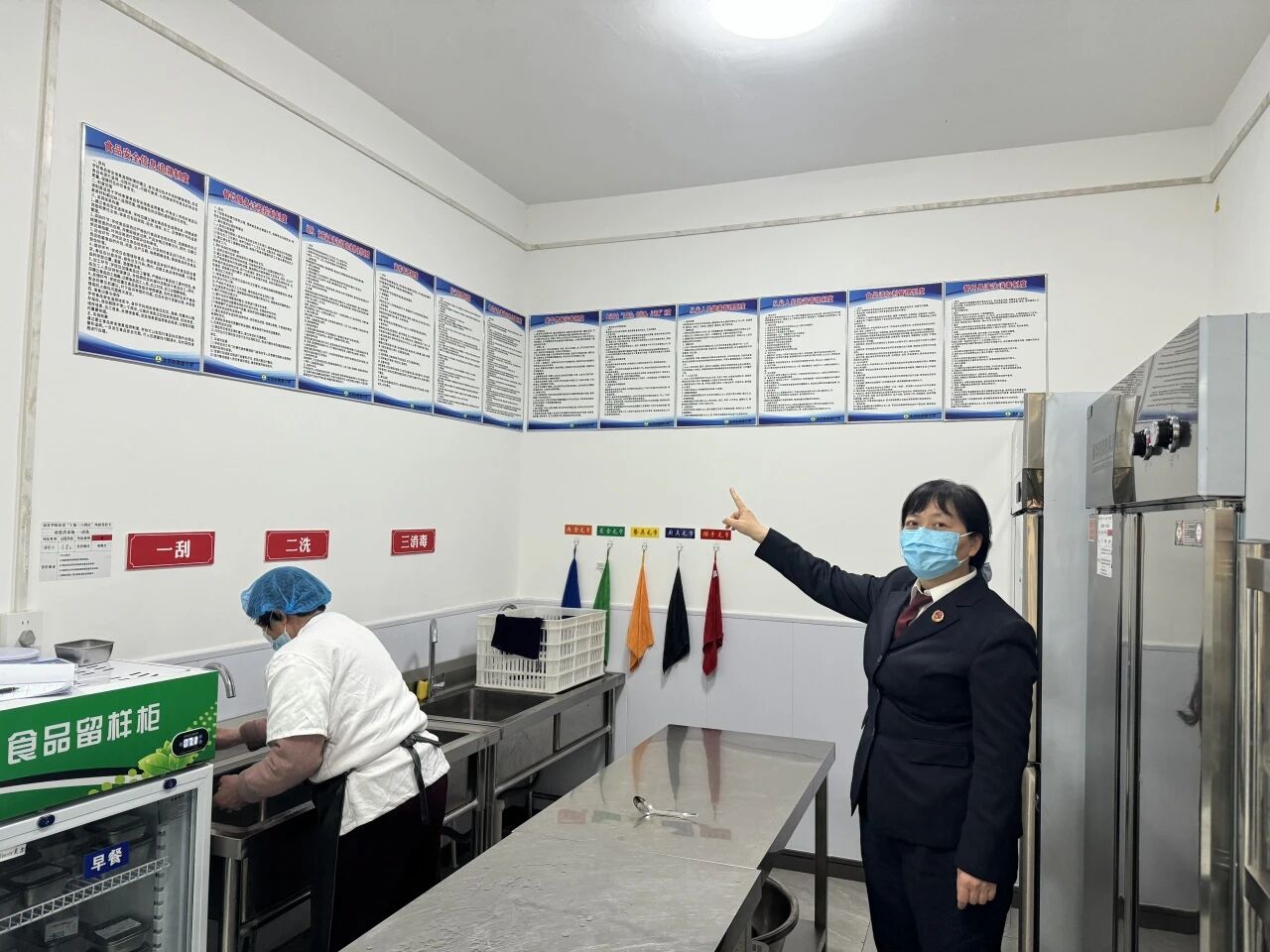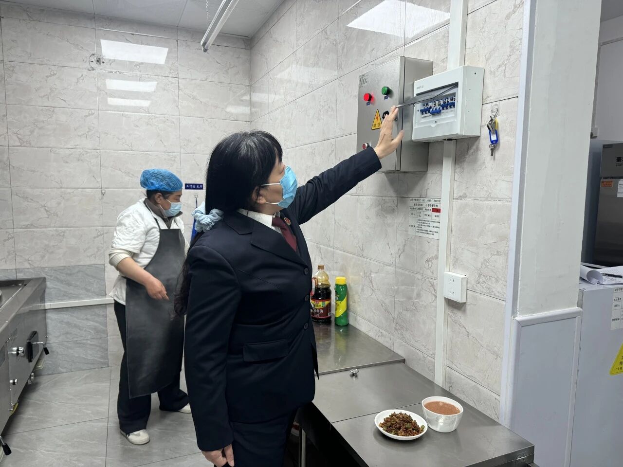 法治授课结束后,法治副校长与校方安保负责人一起对校园重点区域的安全设施运行情况进行了实地检查。主要对学校食堂的环境卫生状况、从业人员健康管理、入职查询等情况进行了检查,并提醒校方安保负责人,校园食品安全关系重大,要严防食品安全事故的发生,守护学生“舌尖上的安全”。